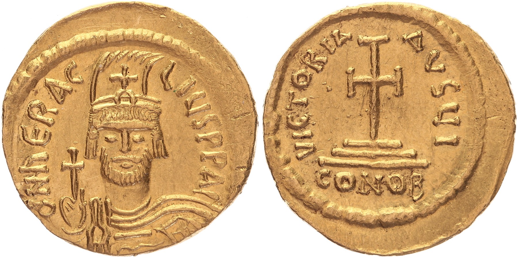 AV Solidus ((4.47 gm, 20.9 mm). Constantinople mint, 10th officina. Struck 610-613. Draped and cuirassed facing bust, wearing plumed helmet, holding cross / Cross potent set on two steps; I//CONOB. DOC 1b; MIB 1a; SB 729. EF.