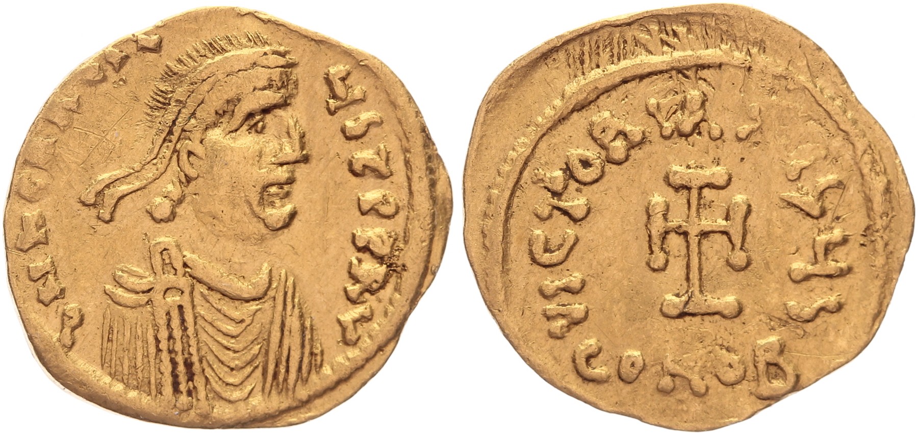 AV Tremissis (1.41 gm, 15mm). Constantinople mint, 6th officina. Struck 613(?)-641. Diademed, draped, and cuirassed bust right / Cross potent; S//CONOB. DOC 54; MIB 74; SB 787. Graffiti, flan slightly wavy, gVF.