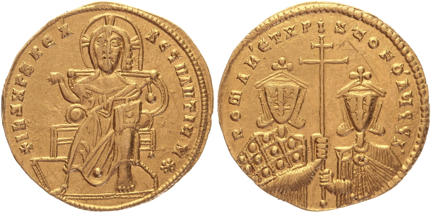 AV Solidus ((4.33 gm, 20.8 mm). Constantinople mint. Struck 924-931. Christ Pantokrator enthroned facing / Crowned facing busts of Romanus, wearing loros, and Christopher, draped, holding patriarchal cross between them. DOC 7; SB 1745. Some scratches and graffiti, gVF.