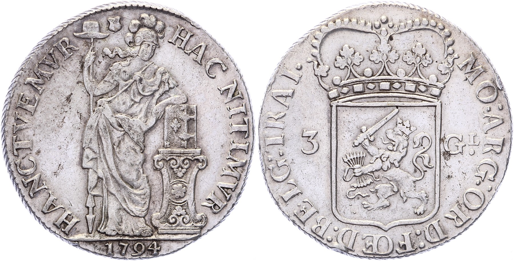 3 Gulden 1794. Delm. 1150; CNM 2.43.117; HPM 71. Vrijwel prachtig.