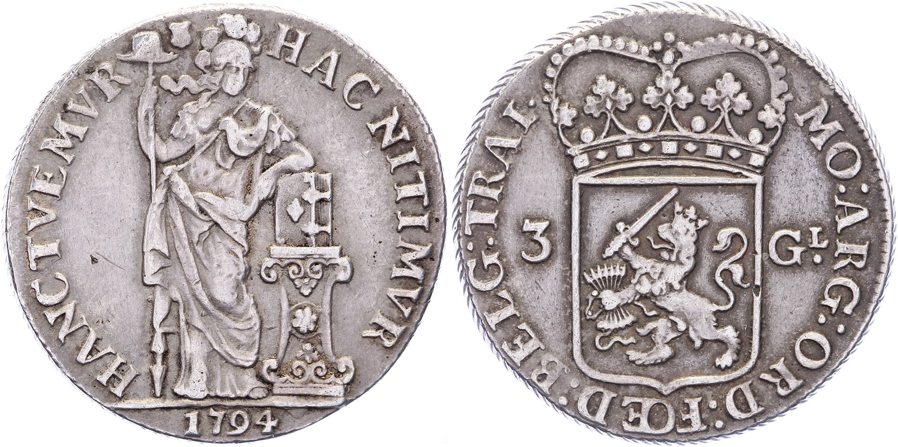 3 Gulden 1794. Delm. 1150; CNM 2.43.117; HPM 71. Vrijwel zeer fraai.