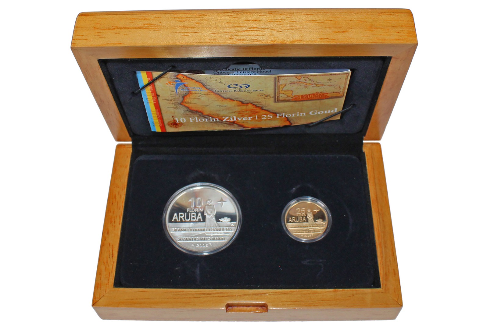 Combinatieset 2006 Status Aparte 20 jaar. Oplage 1.250 / 1.000. Proof in cassette.10 florin (zilver) en 25 florin (goud).