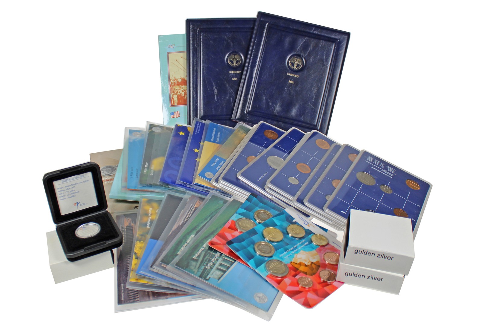 Doos met o.a. 2 x proofsets 1992, 20 stuks FDC-sets 1982-2001, 2 x eurosets, 2 x 10 gulden Marshall FDC, 1 x 5 euro Architectuur proof en 4 x zilveren gulden 2001 proof.