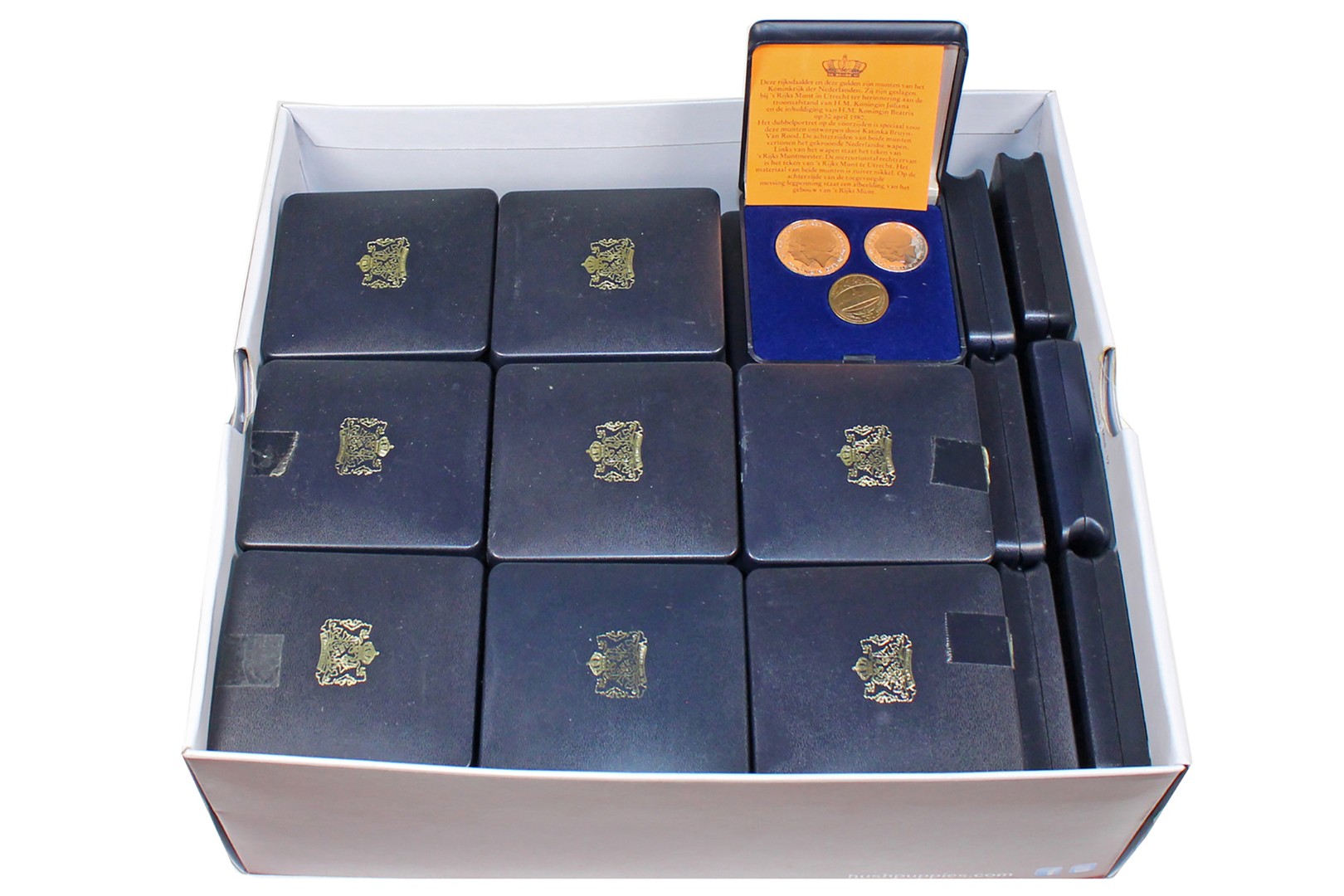 Schoenendoos gevuld met 42 blauwe inhuldigingssets [1 + 2½ gulden 1980].