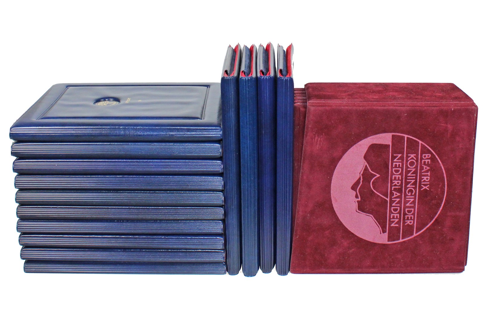 Doos (20) met complete serie proofsets blauw (1982-1995) en bordeauxrood (1996-2001).