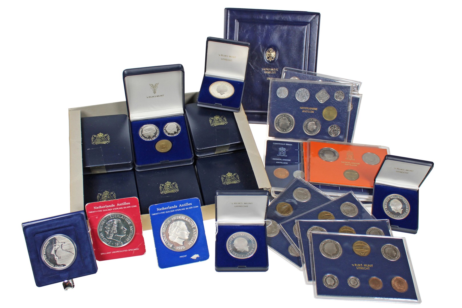 Doos gevuld met FDC-strips 1971 (2x), 1972 (3x), losse rijksdaalders 1972 (14), FDC-set 1979 (4x), inhuldigingsset 1980 (9x), 1 x proofset 1983, 50 gulden 1984 proof. Nederlandse Antillen 13 x FDC-set, 25 gulden 1976 (2x) en 50 gulden 1980 (3x).