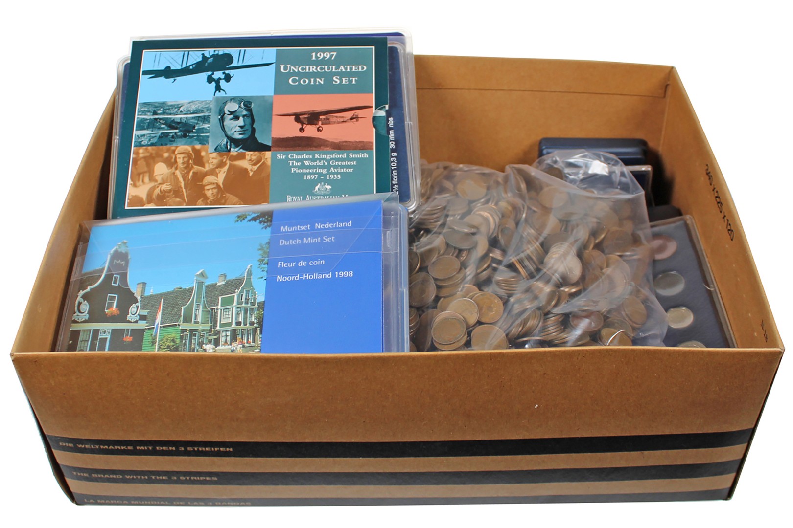 Doos met voornamelijk moderne uitgiften zoals jaarsets etc. Twee zilveren Van Gogh-penningen. Toegevoegd: ca. 4500 Juliana-centen.