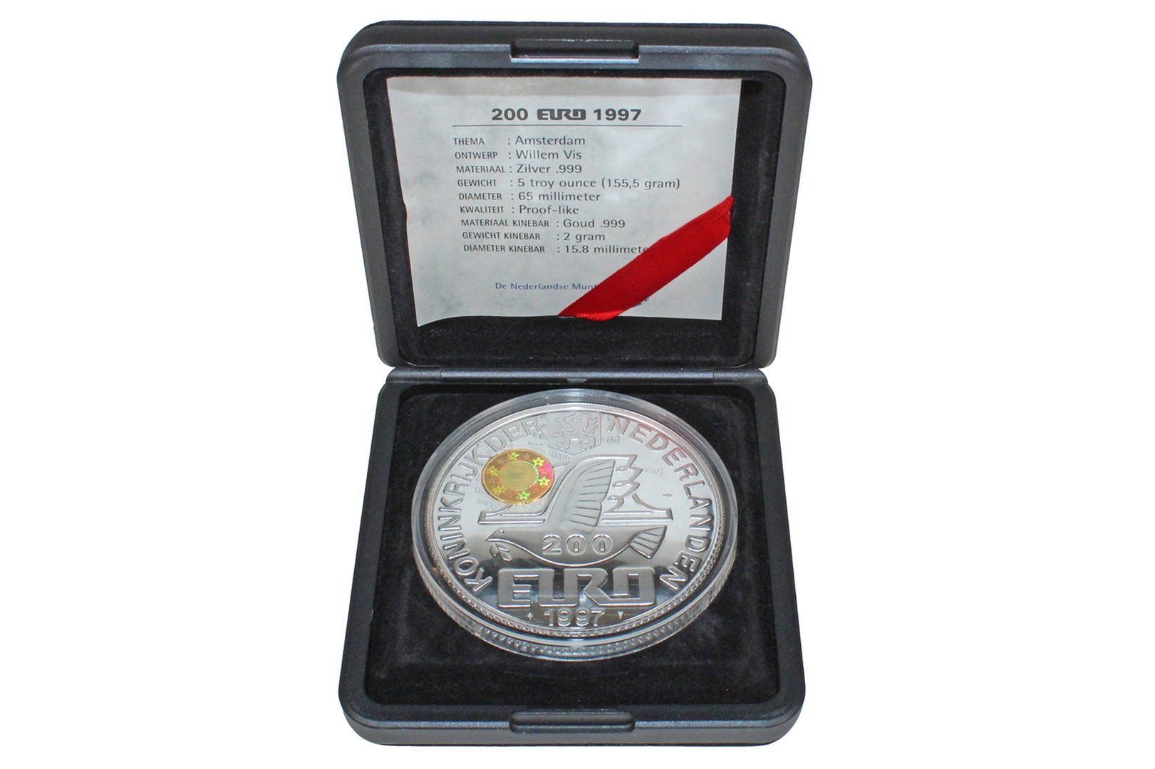 200 Euro 1997 (voorloper) ‘Amsterdam’. 155,5 gram zilver + 2 gram kinebar van goud. Proof.