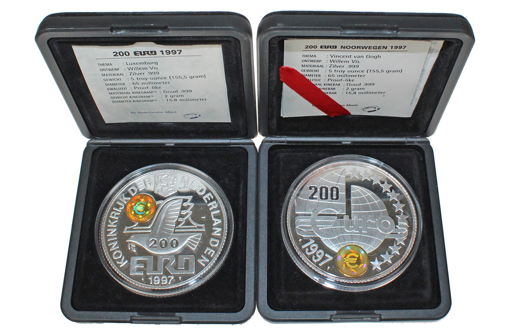 Lot (2) 200 Euro 1997 (voorloper) ‘Luxemburg’ + Vincent van Gogh. 155,5 gram zilver + 2 gram kinebar van goud. Proof.
