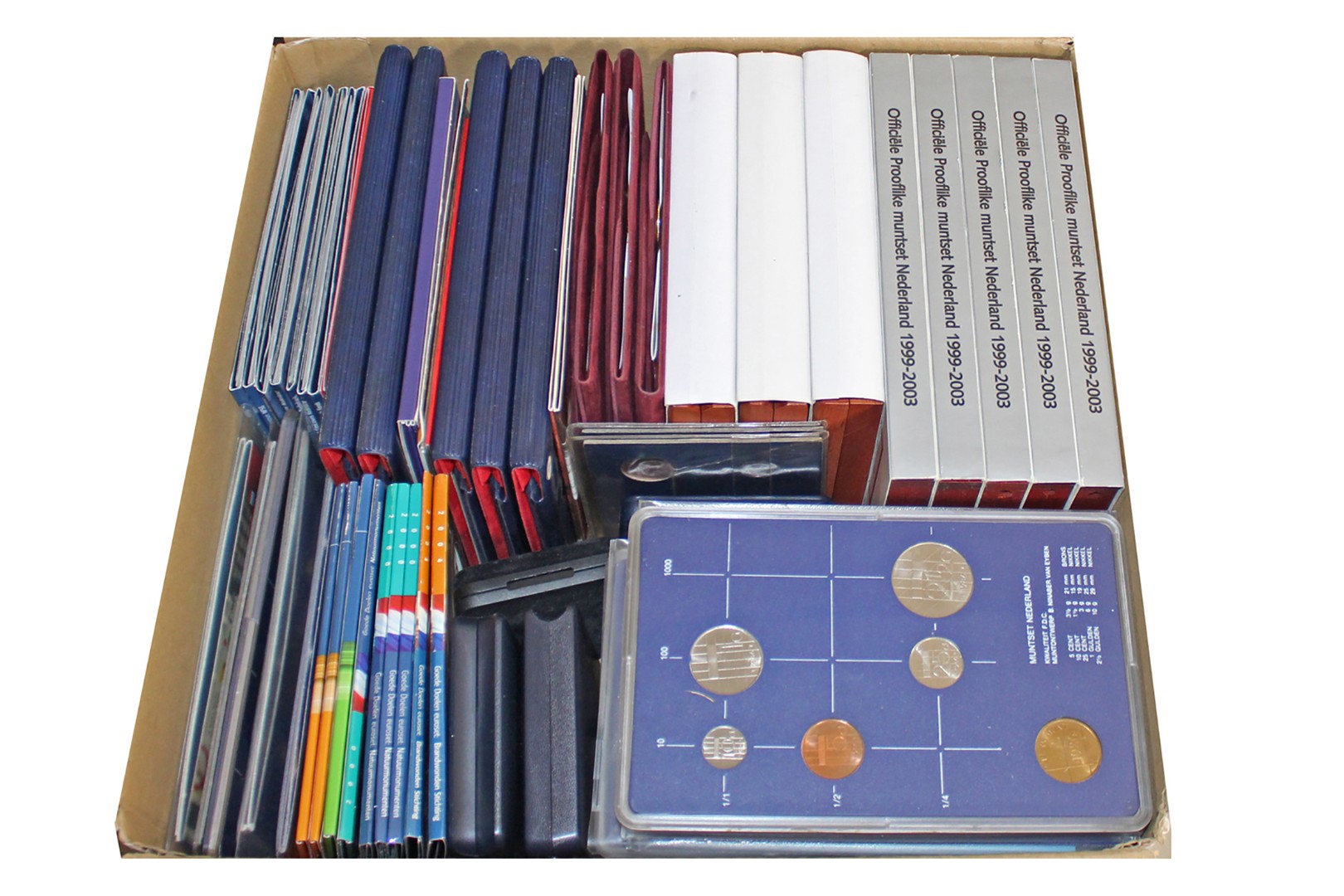 Doos met 16 proofsets 1984-2006. Alsmede 20 eurosets, goede doelen- en huwelijkssets etc. Daarbij ook nog ca. 20 sets uit de guldenperiode.