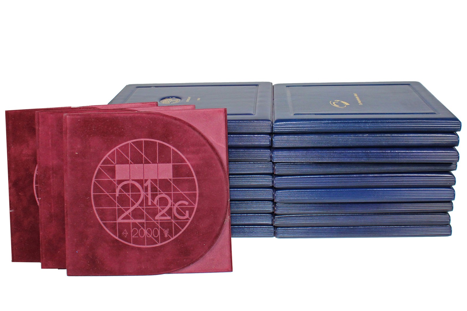 Doos (21) met 18 blauwe en 3 x bordeauxrode proofsets. Geen compl. Serie! (wel 1982).