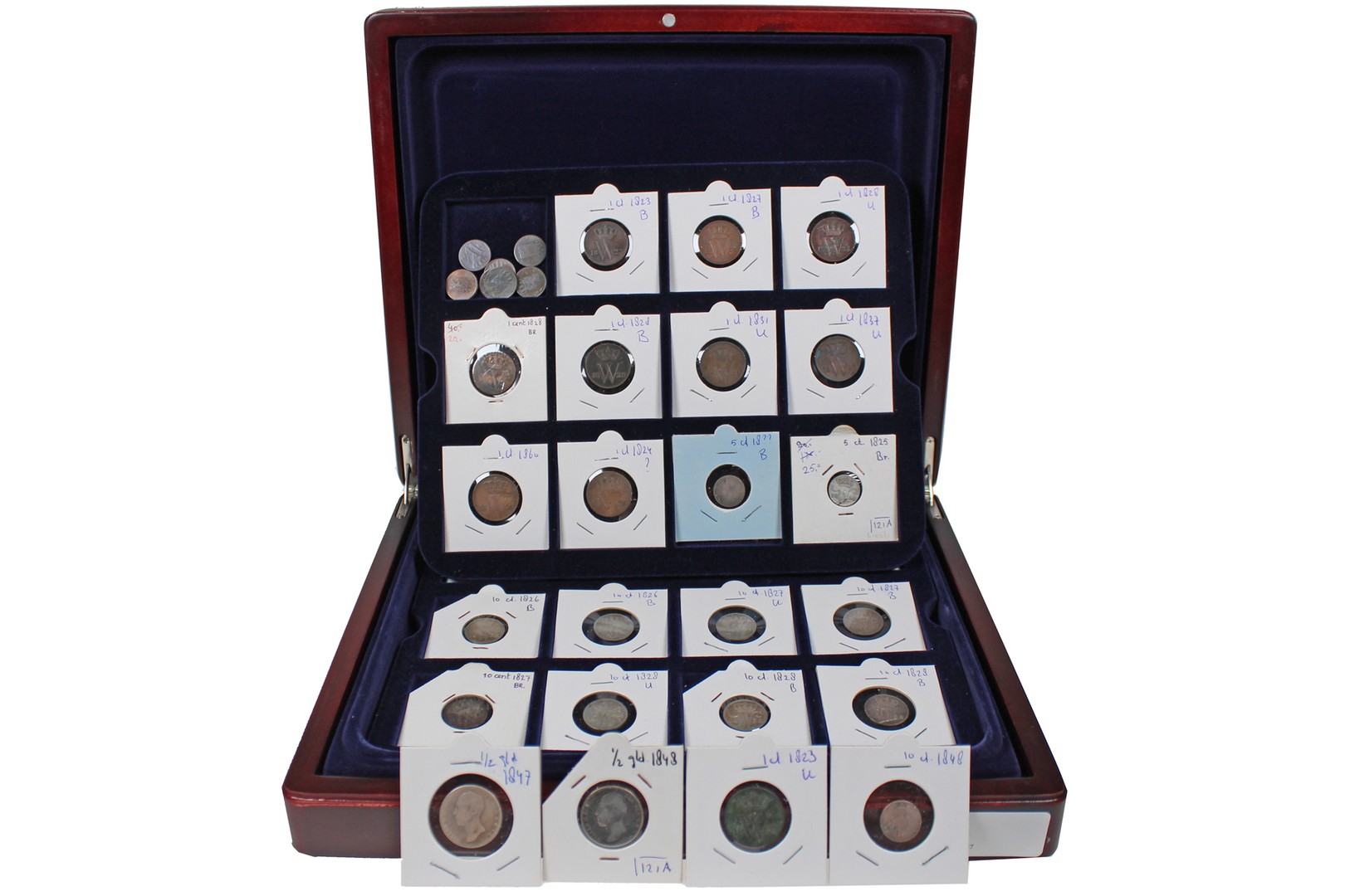 Kistje met uitsluitend Willem I en Willem II ½ centen, centen, stuivers, dubbeltjes en kwartjes. Weliswaar in een matige kwaliteit maar toch niet onaardig. Ca. 50 stuks. Zeer goed / Fraai en beter.