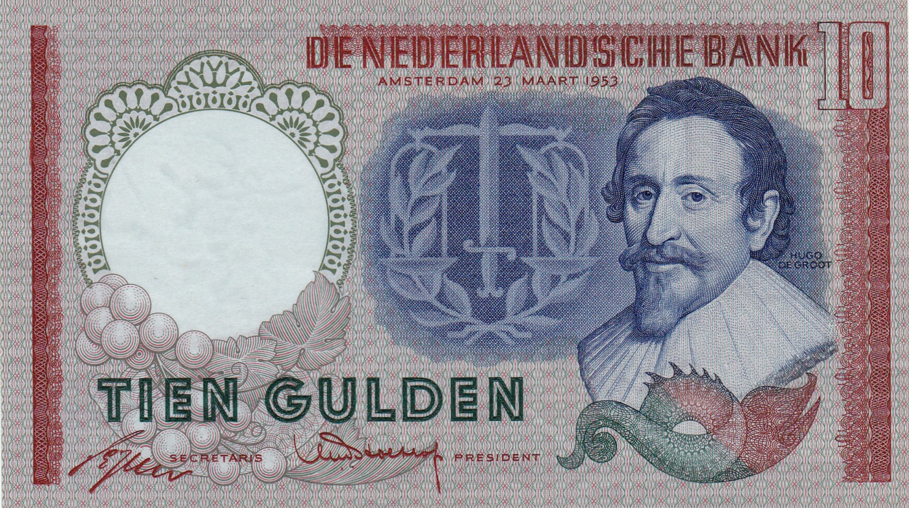 10 Gulden 1953 Hugo de Groot. Mev. 48-1b; AV 36.1b; PL 45c [# BQM 093646]. Unc.