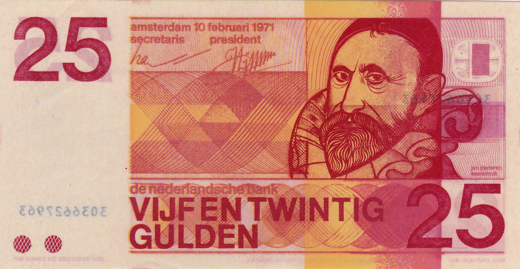 25 Gulden 1971 Sweelinck. Mev. 84-1; PL 70a [# 3036627963]. Aparte misdruk!De kenners onder u mogen dit biljet tijdens de kijkdagen uitgebreid onder de loep nemen, heel bijzonder.