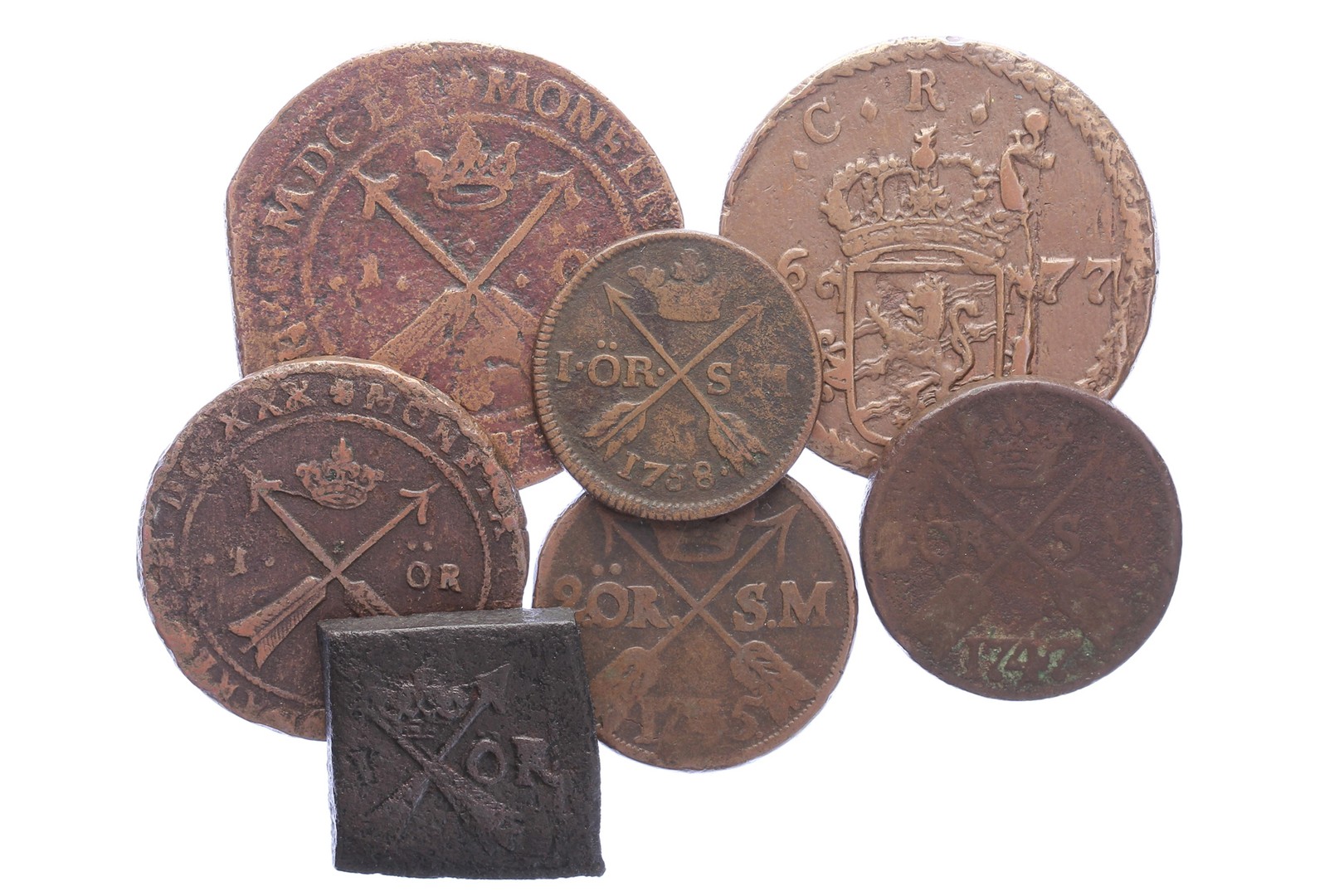 Lot Zweden (7), o.a. 1 Öre 1627, 1630, 1651,1677 en 1758, 2 Öre 1745 en 1747.