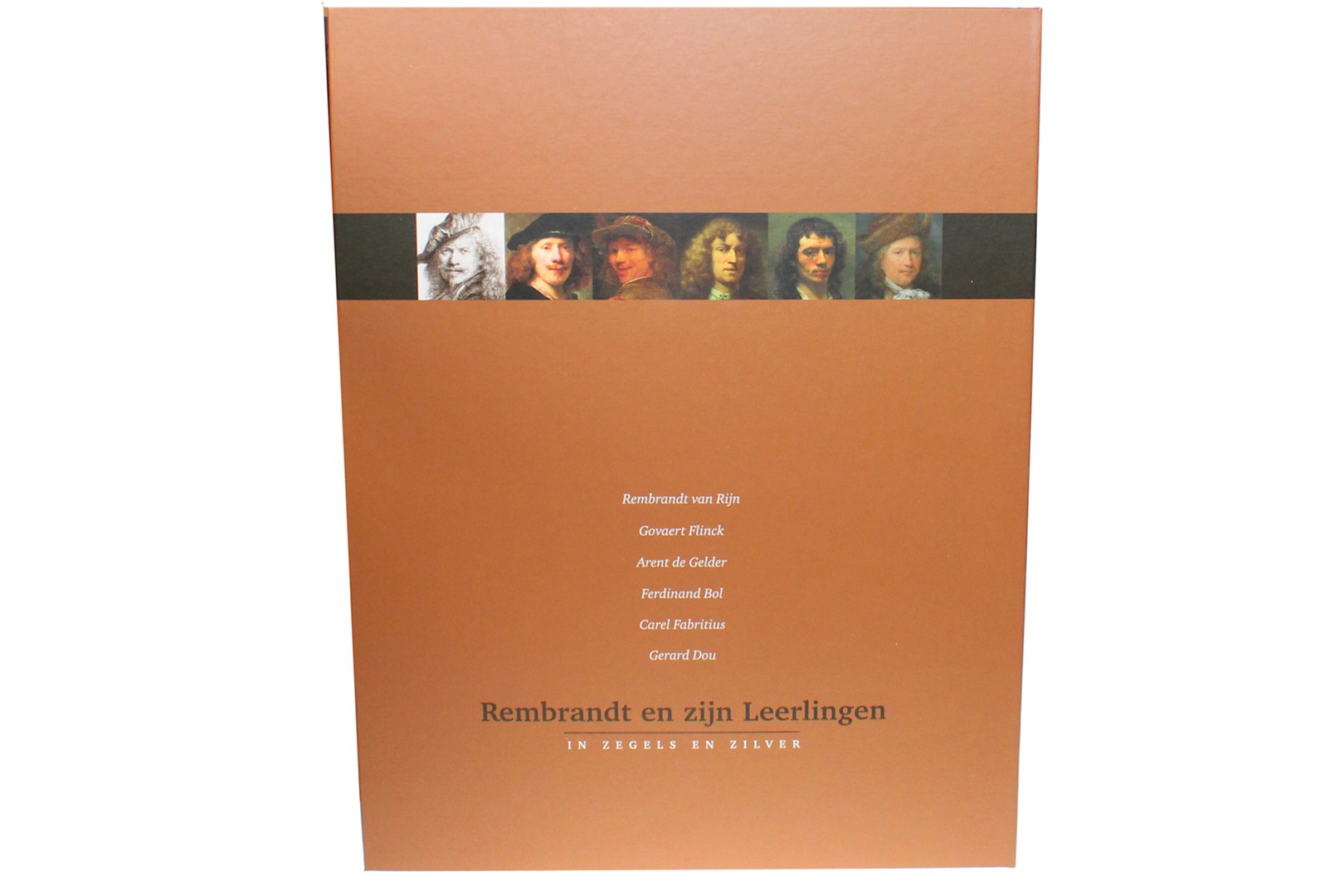 Bruine band “Rembrandt en zijn Leerlingen” met 36 zilveren penningen en 144 postzegels à € 0,39.Netto zilver: 273 gram + € 56,16 aan postzegels.