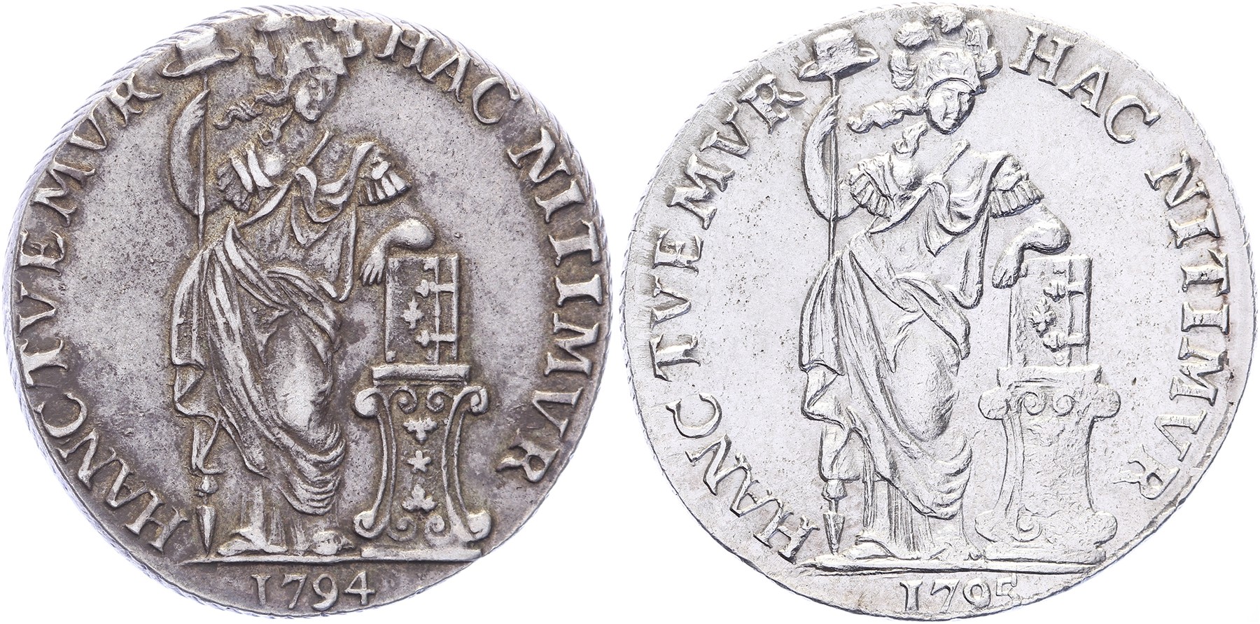 Lot (2) 3 Gulden 1794 en 1795. Delm. 1147; CNM 2.46.55; HPM 46. Zeer fraai.
