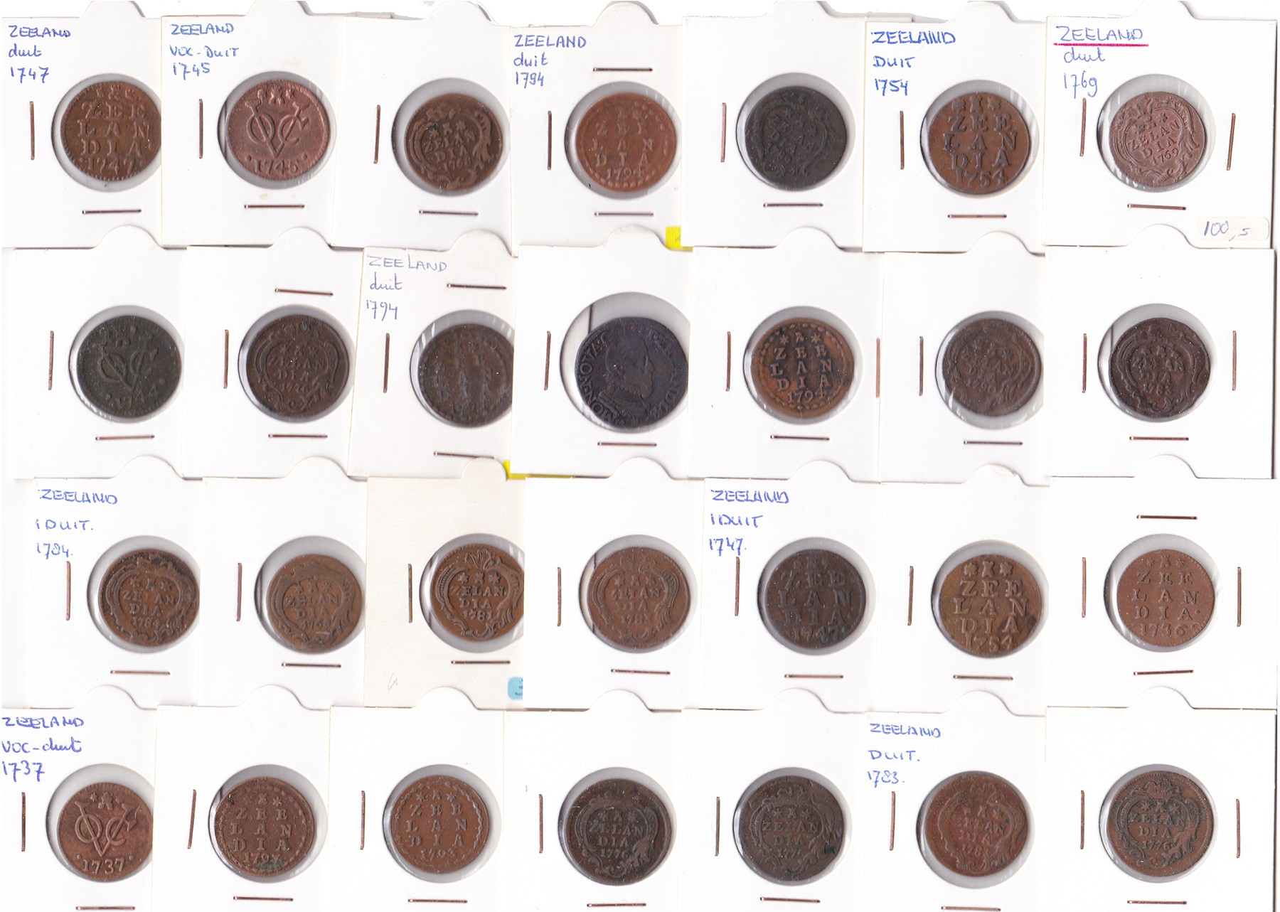 Doos met geweldig mooi lot met Zeeuwse duiten en VOC-duiten. Veel verschillende jaartallen. Ca. 45 stuks. Overwegend betere kwaliteit.