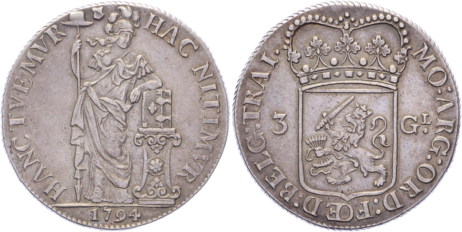 3 Gulden 1794. Delm. 1150; CNM 2.43.117; HPM 71. Bijna prachtig.