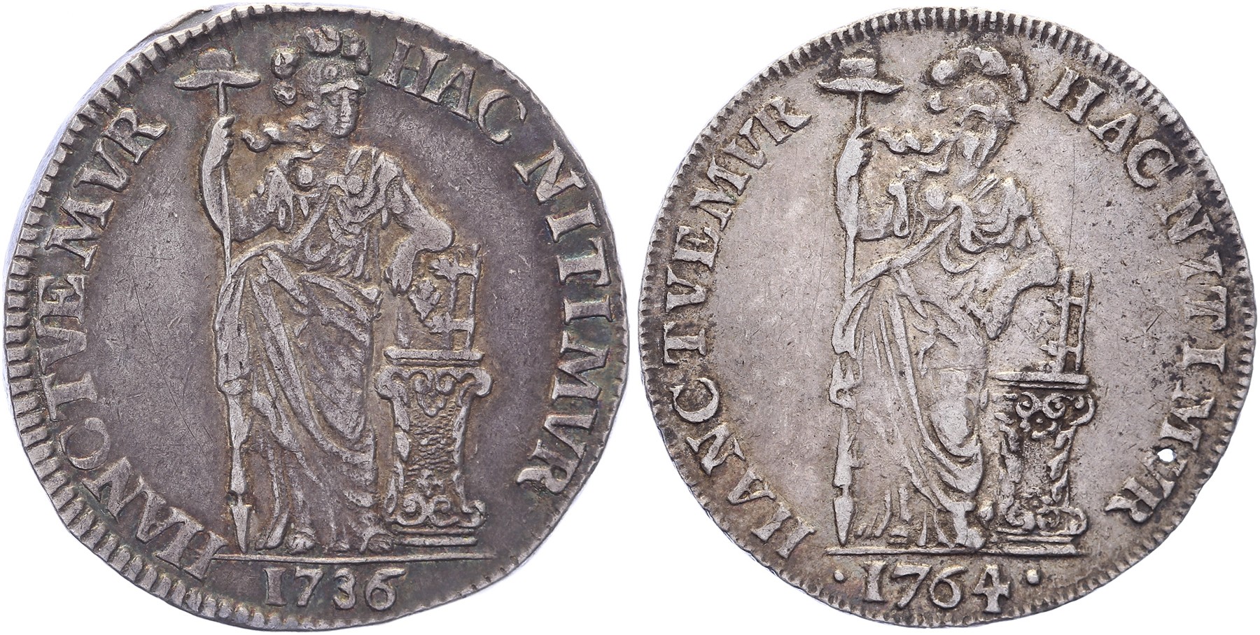 Lot (2) 1 Gulden 1736 en 1764. Delm. 1184; CNM 2.38.92 + 93; HPM 55. Zeer fraai / Prachtig.