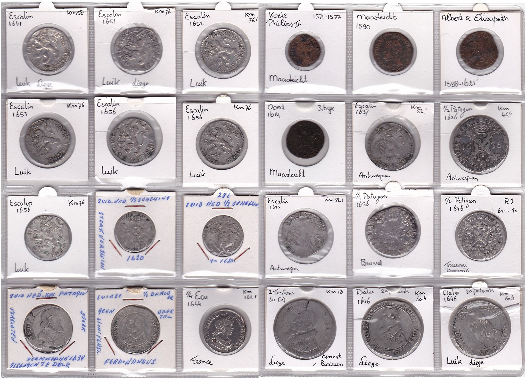 Grijze muntslof met lot (24) Zuidelijke Nederlanden o.a. Maastricht en Antwerpen, Brussel en Luik. Diverse kwaliteiten.