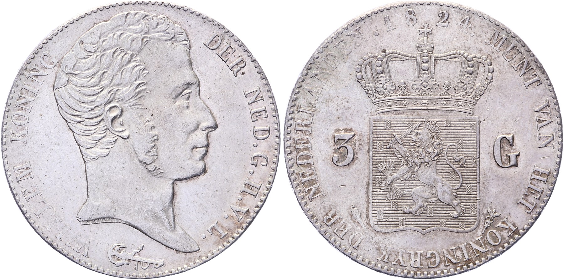 3 Gulden 1824 Utrecht mmt. fakkel Sch. 246a. Streepje tussen kroon en wapen Zeer fraai / Prachtig