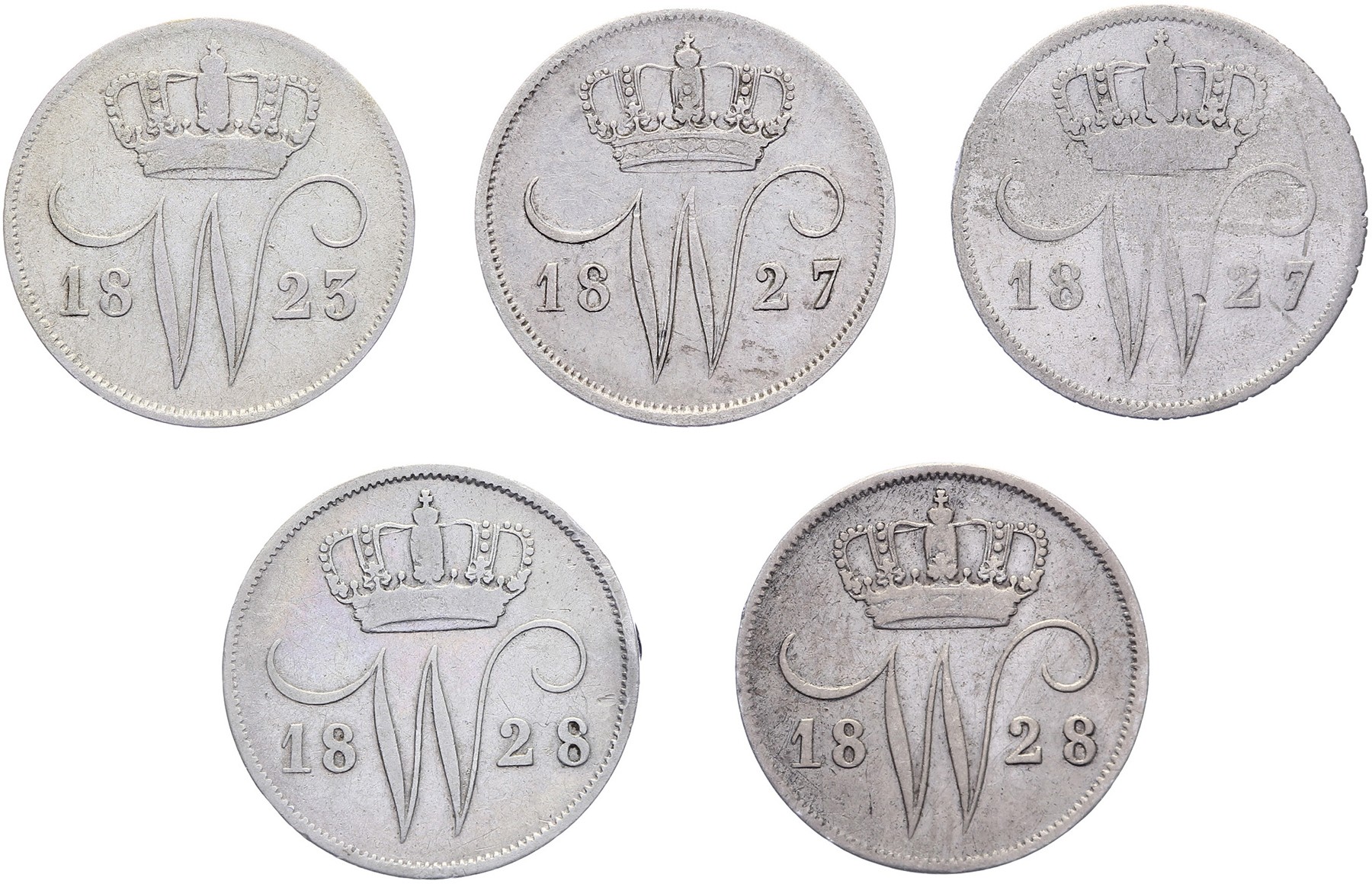 Lot (5) 10 Cents 1823B, 1827U, 1827B, 1828U+B Sch. 309, 307, 312, 308, 313 Overwegend fraai