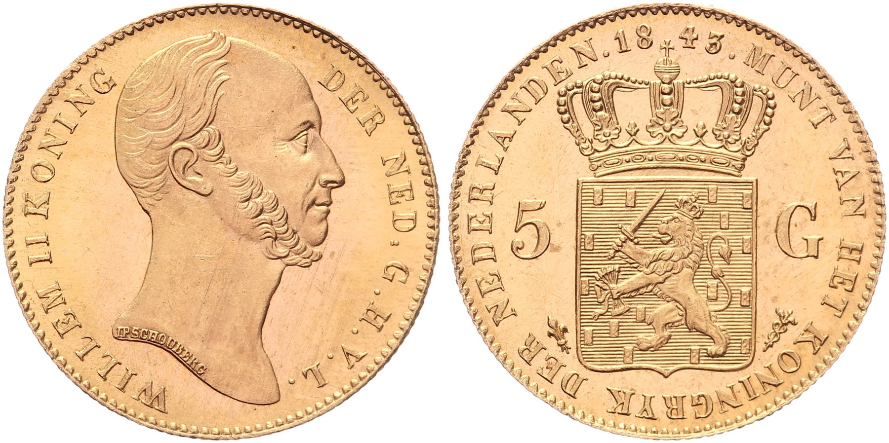 5 Gulden 1843 mmt. lelie Sch. 503. Exceptioneel mooie kwaliteit FDC