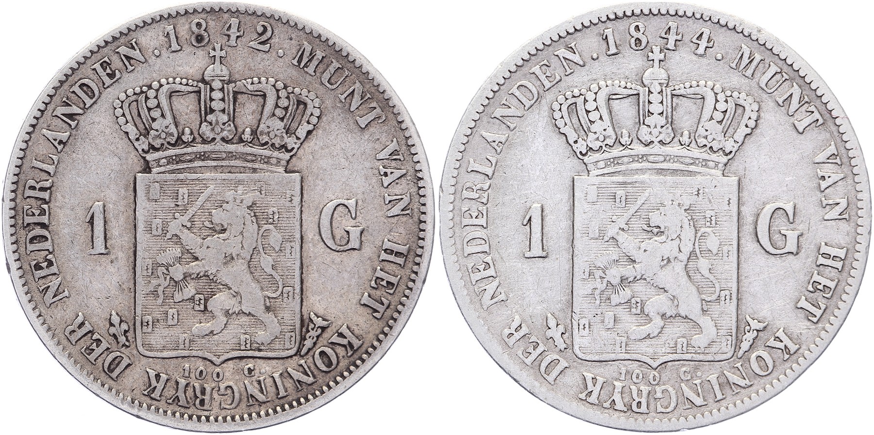 Lot (2) 1 Gulden 1842 en 1844 mmt. lelie Sch. 519 en 521 Fraai / Zeer fraai