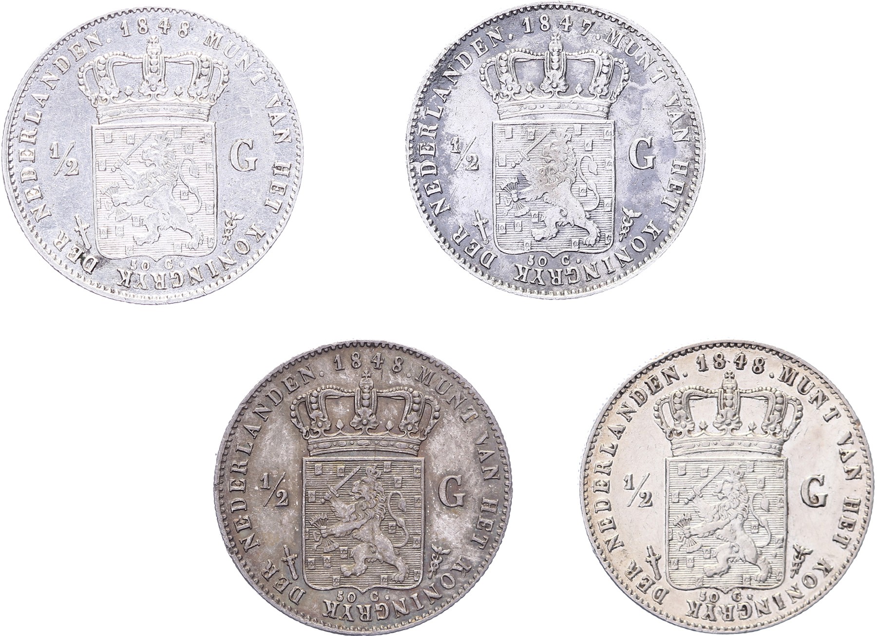Lot (4) ½ Gulden 1847 en 1848 Sch. 530 en 531. Ook jaartalwijzigingen Zeer fraai en beter