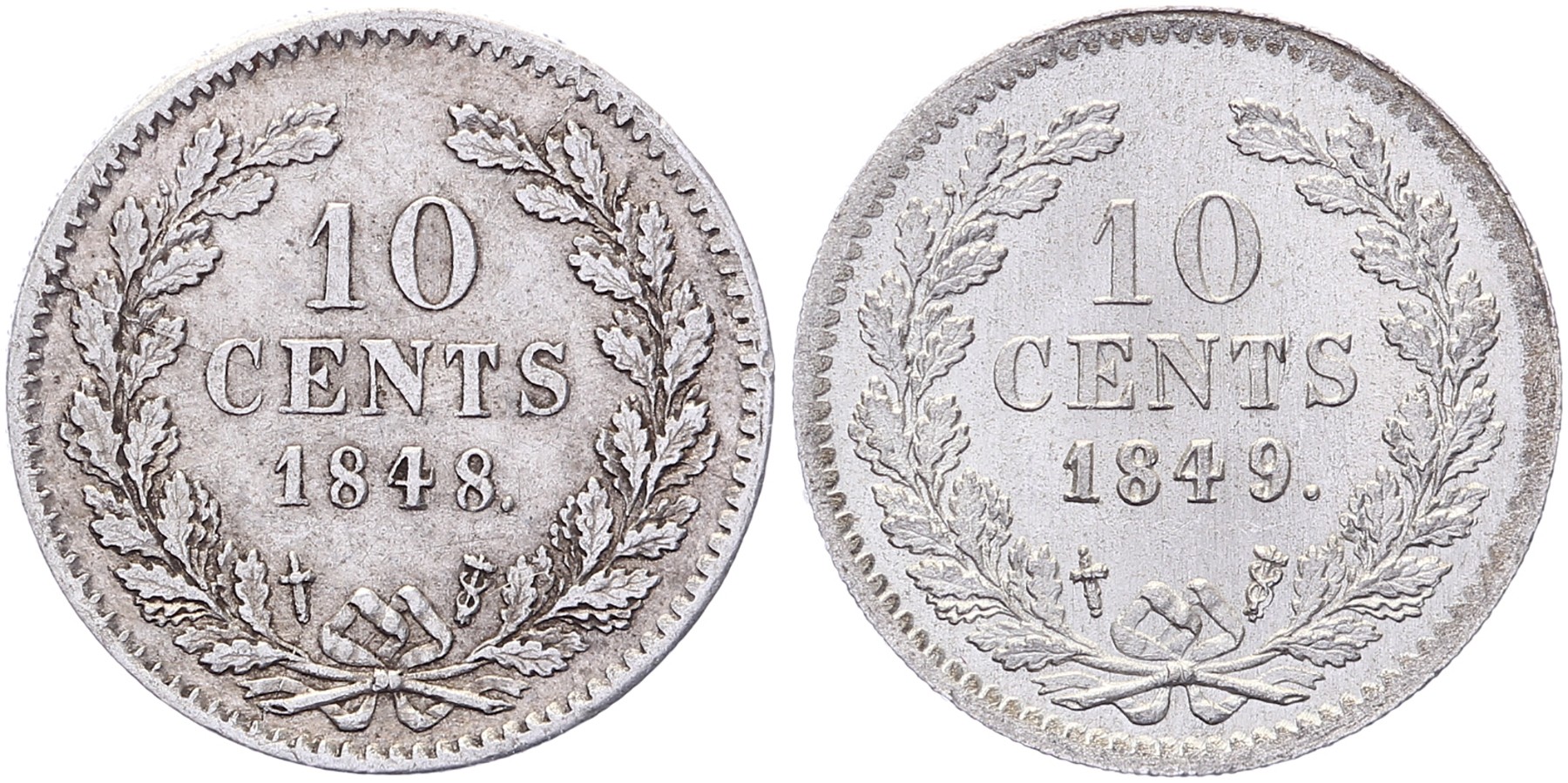 Lot (2) 10 Cents 1848 en 1849 mmt. Sch. 534 en 535 Zeer fraai en beter