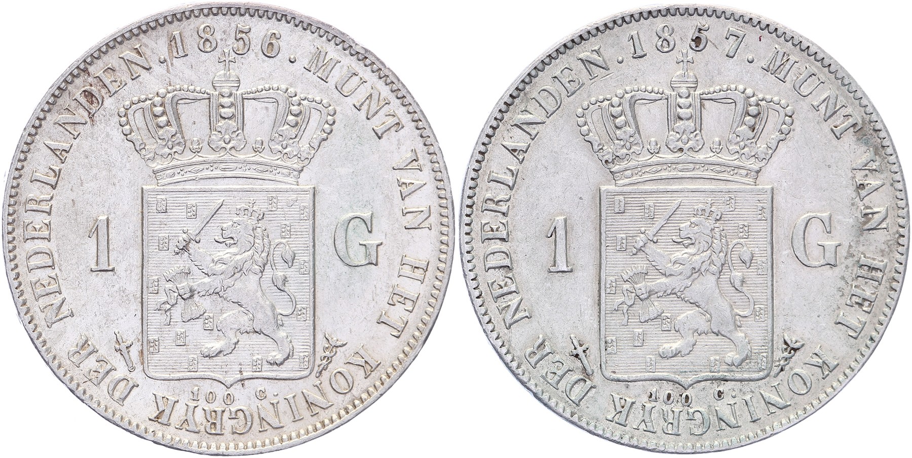 Lot (2) 1 Gulden 1856 en 1857 Sch. 609 en 610 Vrijwel prachtig