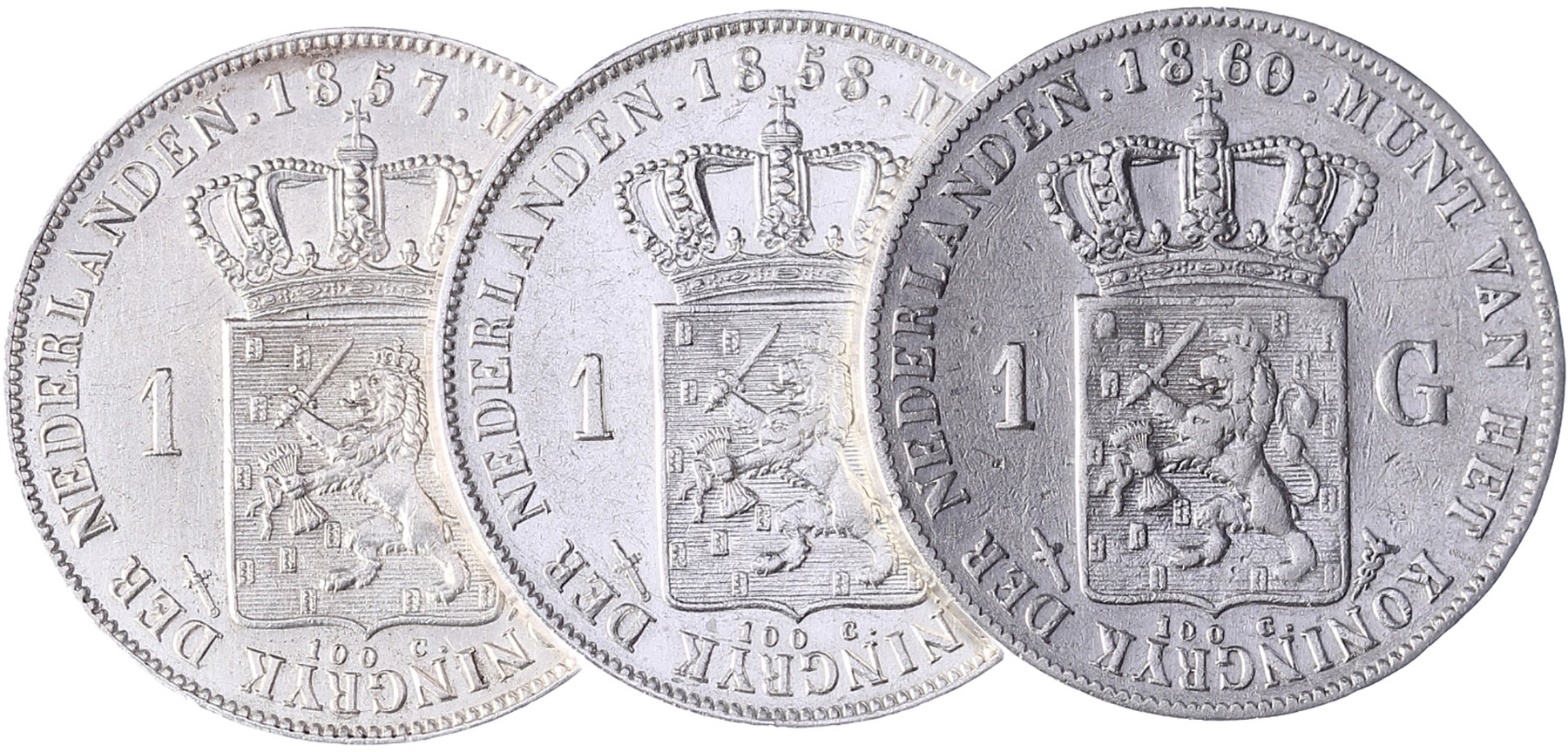 Lot (3) 1 Gulden 1857, 1858 en 1860 Sch. 610, 611 en 613 Zeer fraai en beter