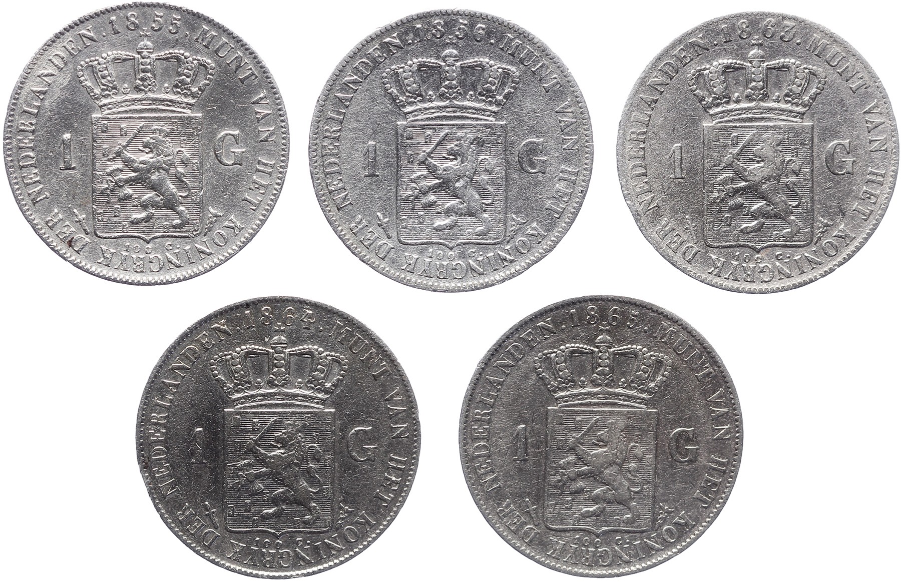 Lot (5) 1 Gulden 1855, 1856, 1863, 1864, 1865 Sch. 608, 609, 615 en 617 Fraai / Zeer fraai