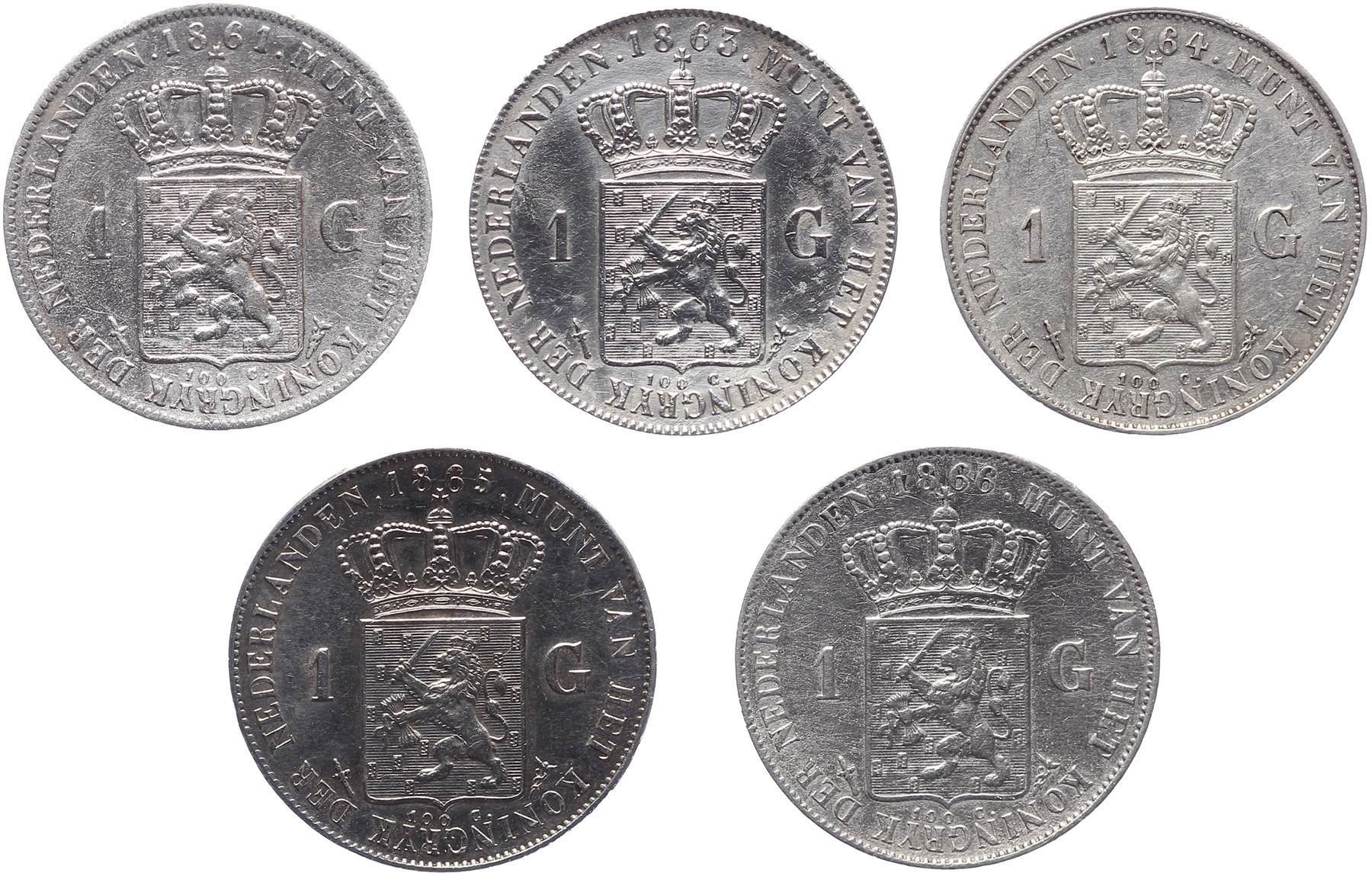 Lot (5) 1 Gulden 1861, 1863, 1864, 1865, 1866 Sch. 614 t/m 618 Zeer fraai en beter