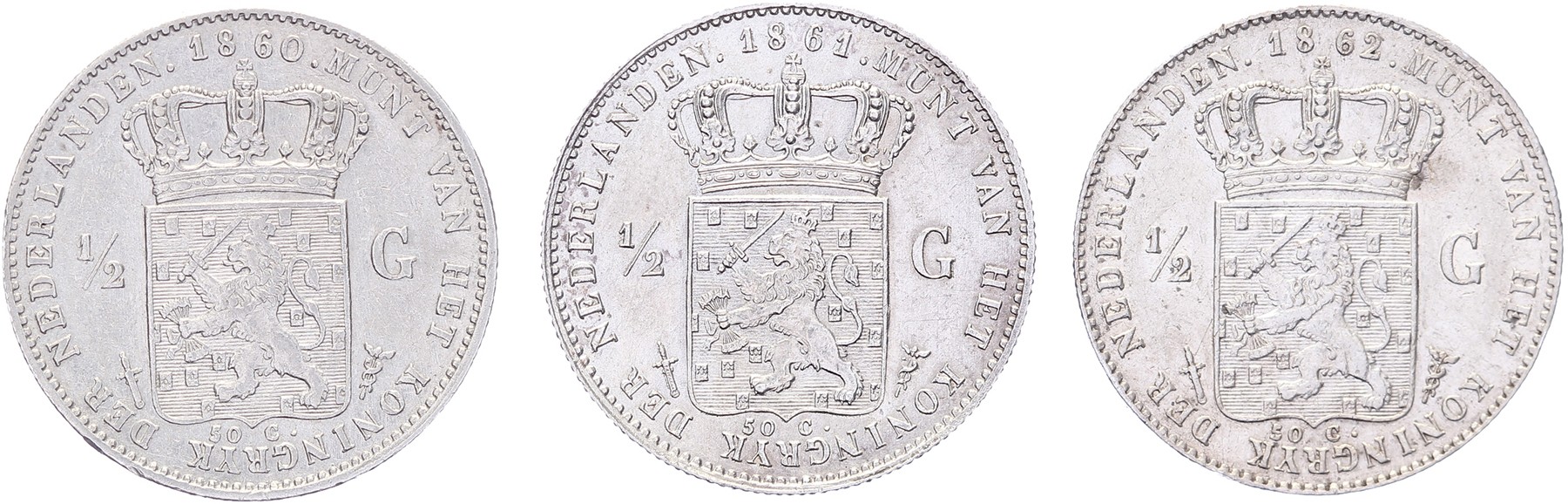 Lot (3) ½ Gulden 1860, 1861 en 1862 Sch. 627, 628 en 629 Zeer fraai en beter