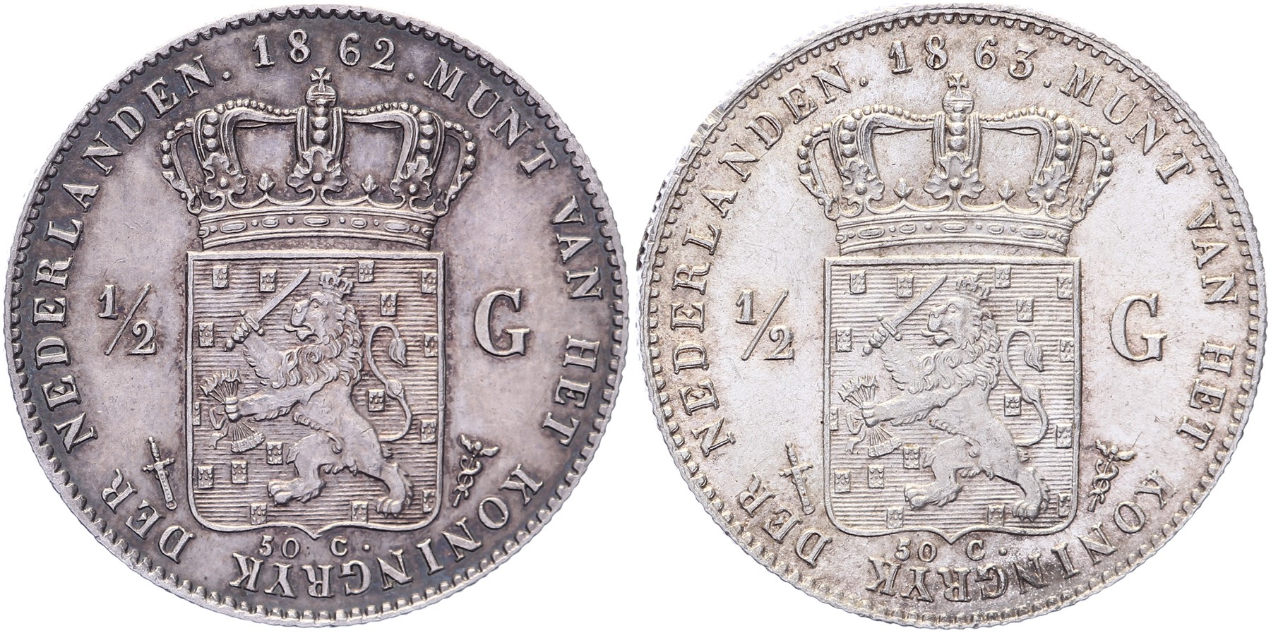 Lot (2) ½ Gulden 1862 en 1863 Sch. 629 en 630 Prachtig / FDC