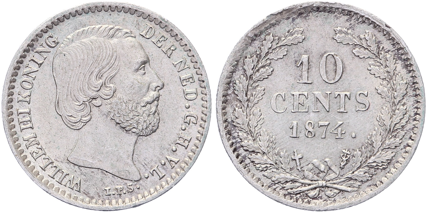 10 Cents 1874 mmt. zwaard met klaverbladvormig uiteinde Sch. 653. Zgn. 2e type Bijna prachtig