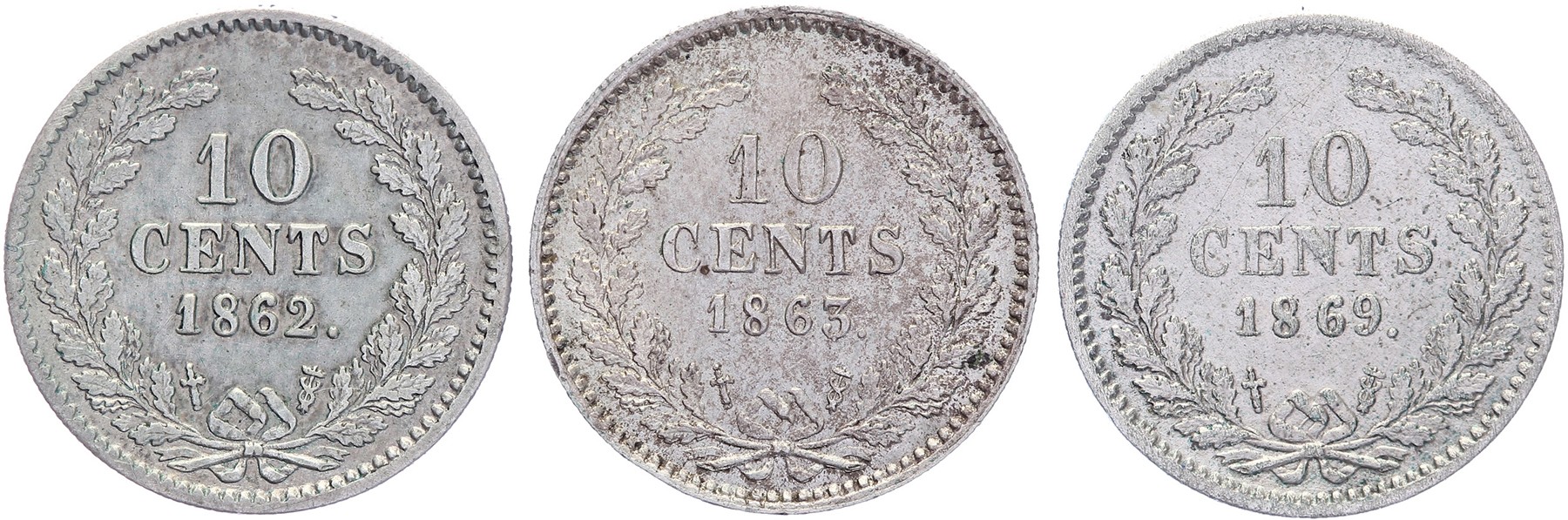 Lot (3) 10 Cents 1862, 1863 en 1869 Sch. 646, 647 en 649 Fraai / Zeer fraai