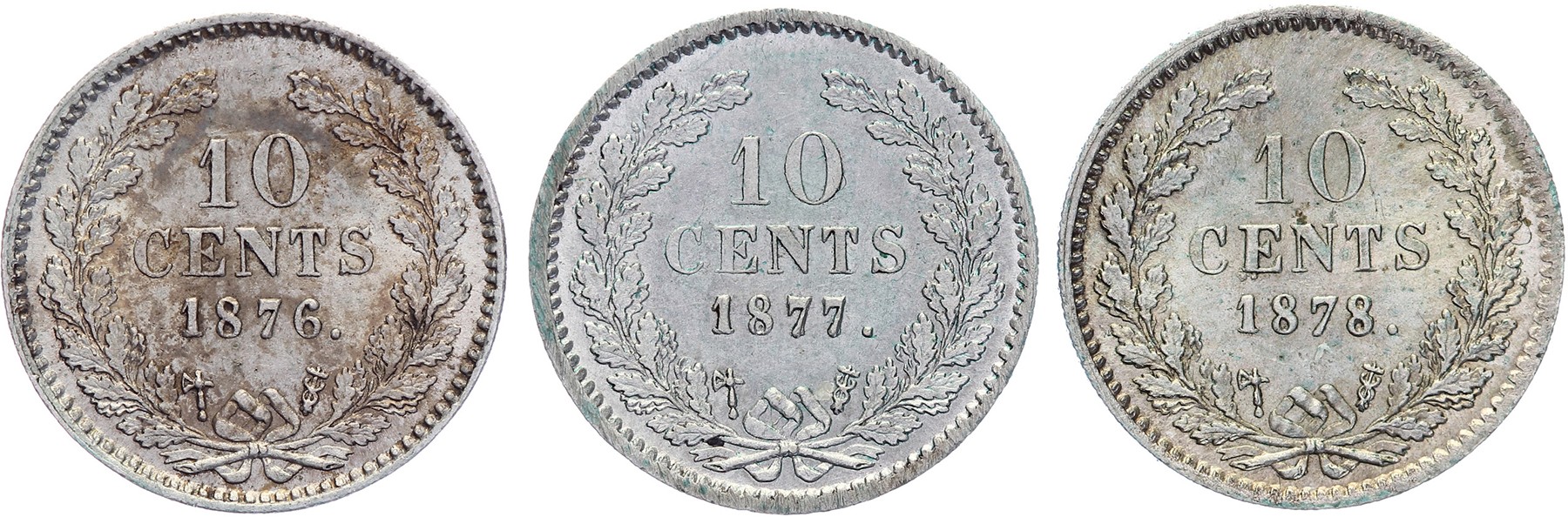 Lot (3) 10 Cents 1876, 1877 en 1878 Sch. 654, 655 en 656 Zeer fraai en beter