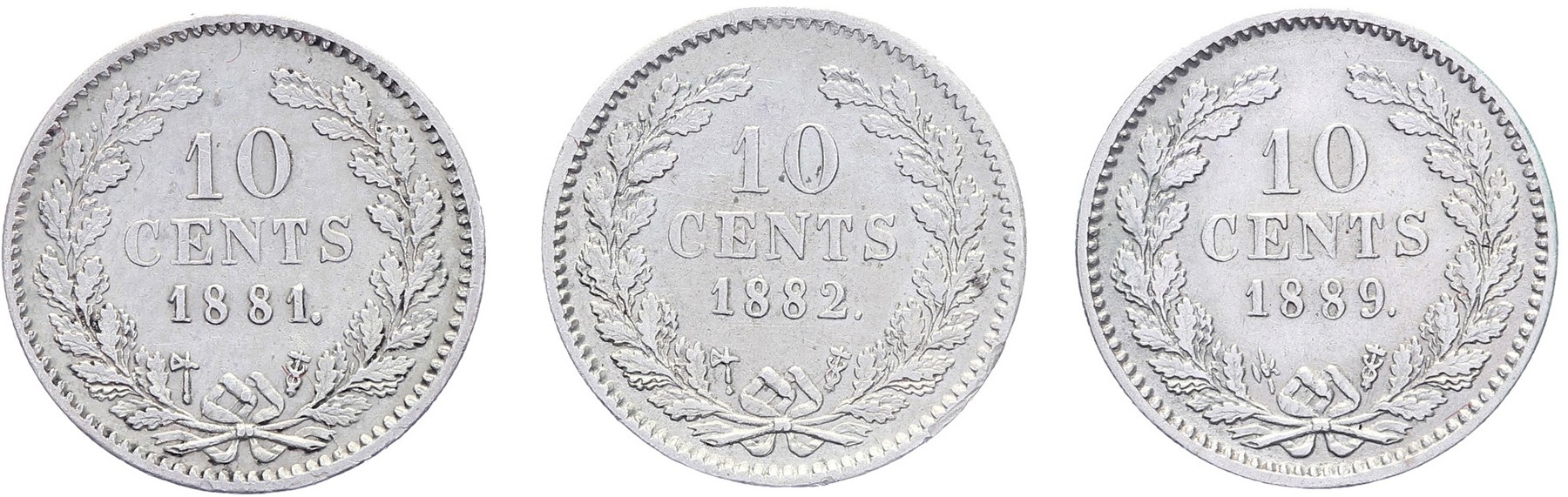 Lot (3) 10 Cents 1881, 1882 en 1889 Sch. 659, 660 en 664 Overwegend zfr.