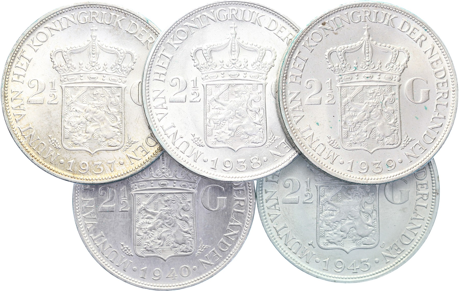 Lot (5) Rijksdaalder 1937 t/m 1940 en 1943D Sch. 789, 790, 791, 792 en 1072 Zeer fraai / Prachtig