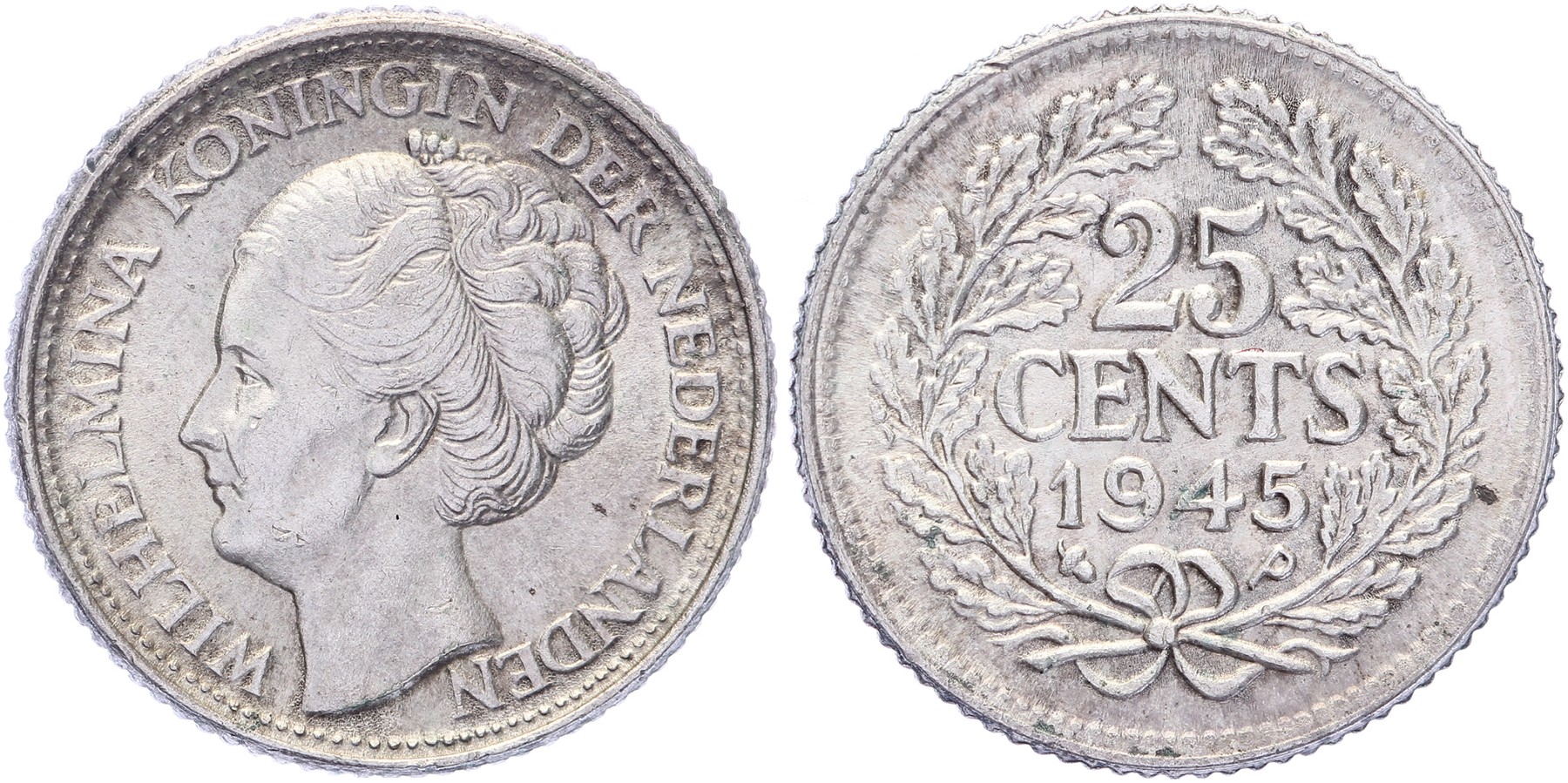 25 Cents 1945P mmt. eikel Sch. 1058 Zeer fraai / Prachtig