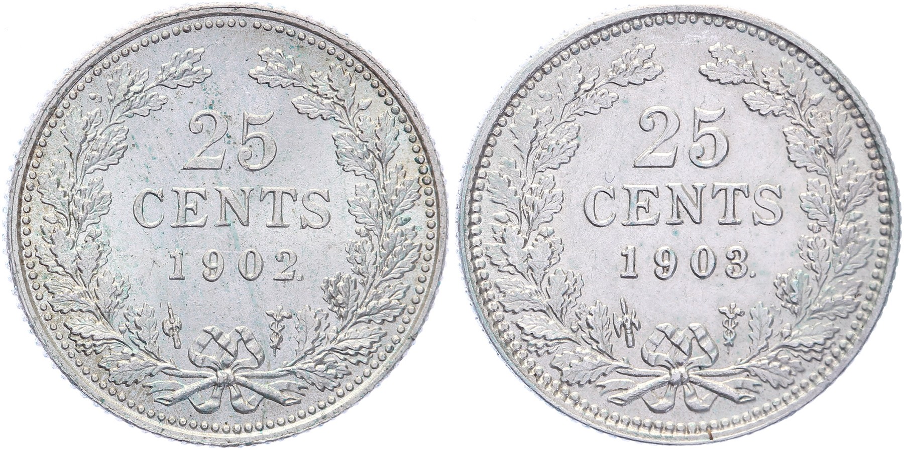 Lot (2) 25 Cents 1902 en 1903 Sch. 855 en 856 Zeer fraai / Prachtig