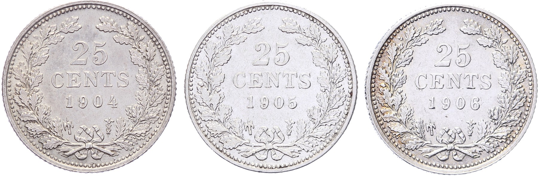 Lot (3) 25 Cents 1904, 1905 en 1906 Sch. 857, 858 en 859 Zeer fraai / Prachtig