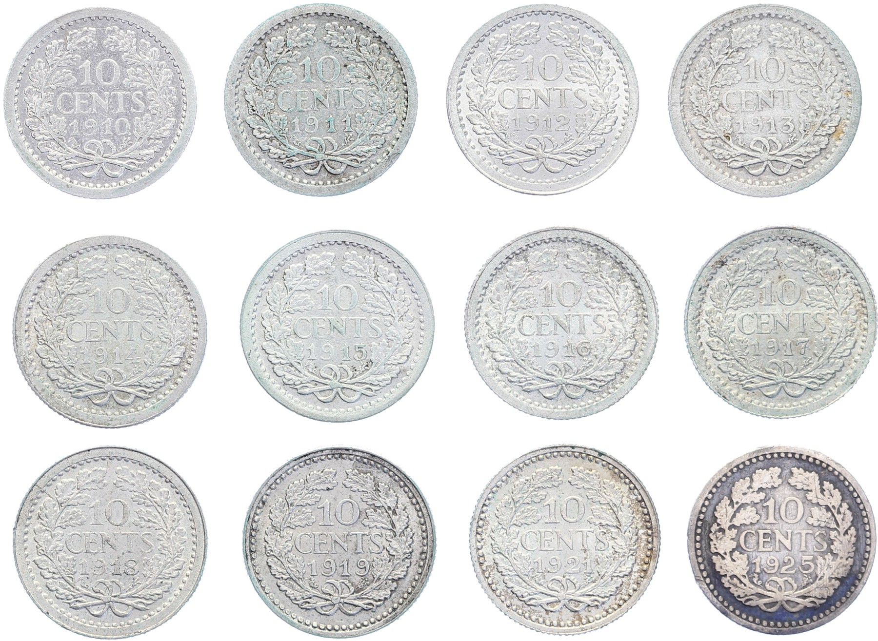 Lot (12) 10 Cents 1910 t/m 1919, 1921 en 1925 Sch. 889 t/m 900. Complete serie dubbeltjes met hermelijnen mantel Zeer fraai en beter