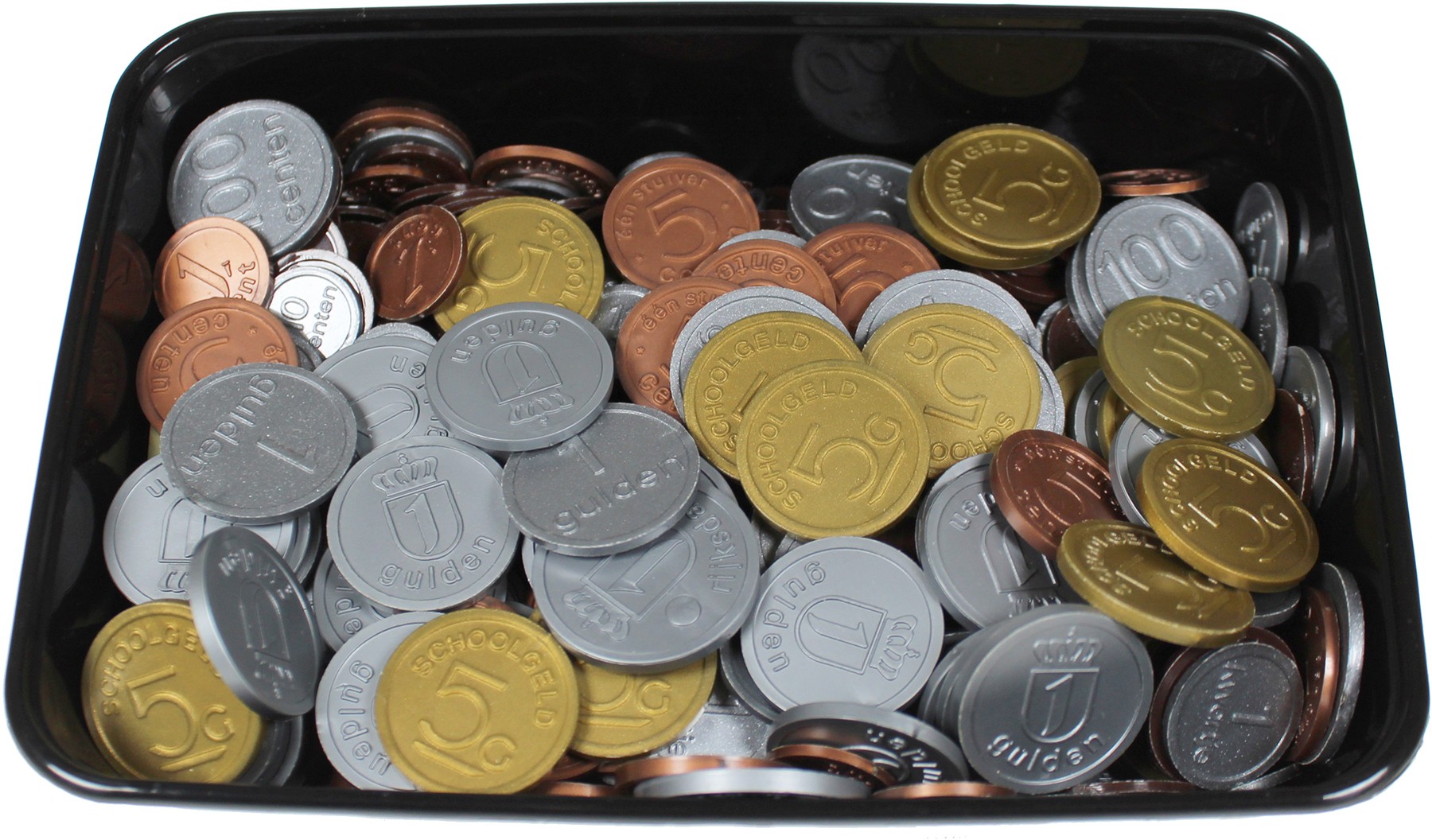 Plastic bakje met groot aantal school- en instructiegeld. Kunststof muntjes ongesorteerd in verschillende soorten en denominaties. UNC.