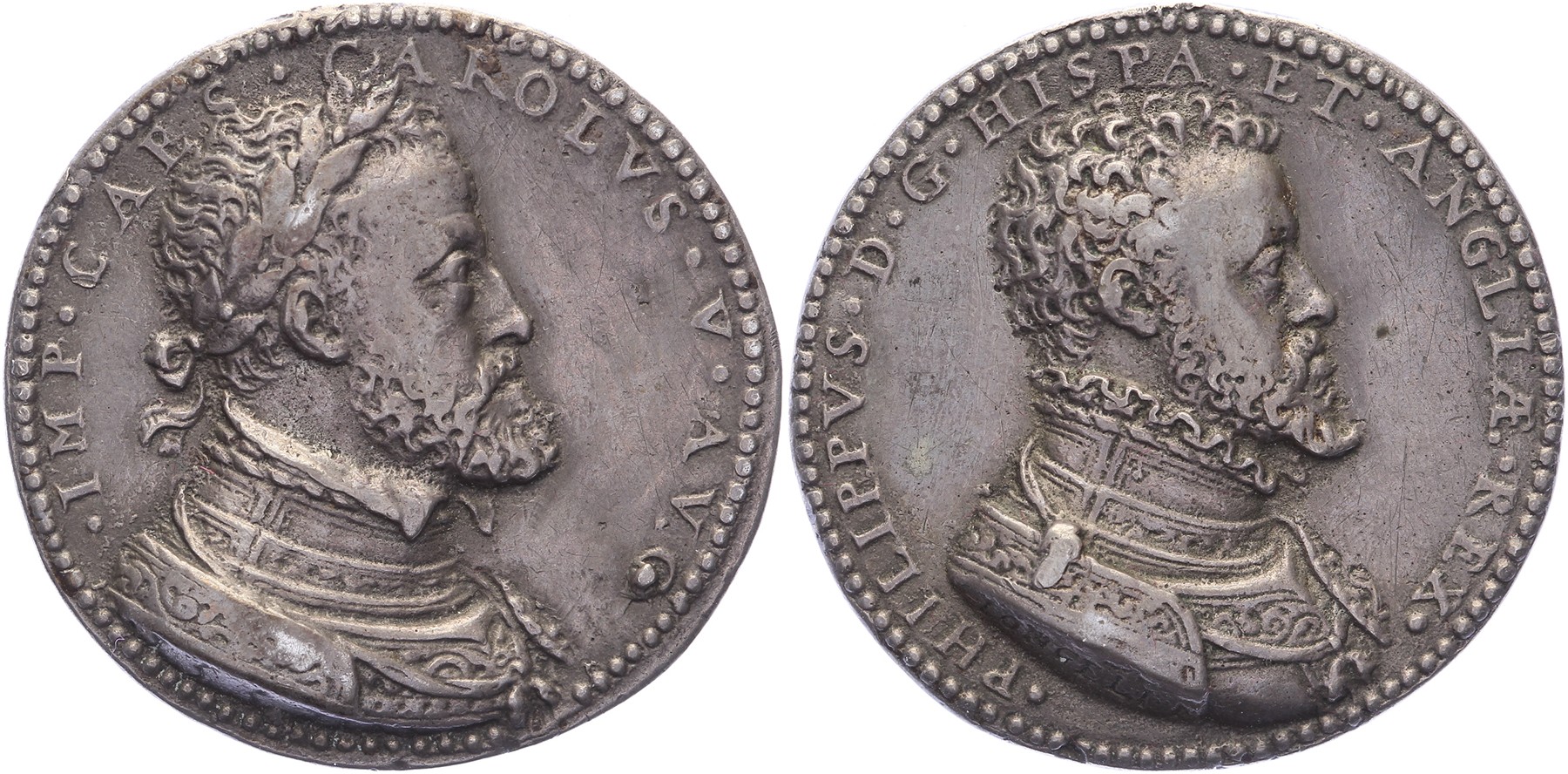 1557 Karel V en Philips II. Borstbeeld van Karel V naar rechts. Omschrift: .IMP. CAES. CAROLVS. V. AVG. / Gepantserd borstbeeld van Philips II naar rechts. Omschrift: .PHILIPPVS. D.G. HISPA. ET. ANGLIÆ. REX.AR gegoten 34,5 [14,22 gram]. Smolderen 10; v. Mieris 378.1. J. Jonghelinck. Kleine randoneffendheid. Zeer zeldzaam. Zeer fraai. - Aangekocht bij Munthandel Verschoor, februari 2012.