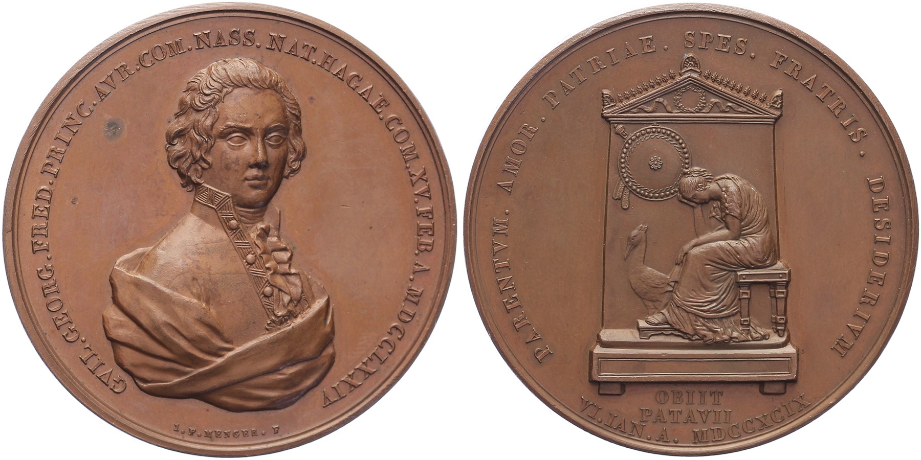 1799 Overlijden Willem George Frederik van Oranje te Padua. Borstbeeld half naar rechts / Grafmonument met treurende vrouw en pelikaan. Æ 47. VvL 846; KPK 3771. J.P. Menger. Vlekje op voorzijde. Prachtig. - N.B. Vervaardigd bij ’s Rijks Munt in 1837.