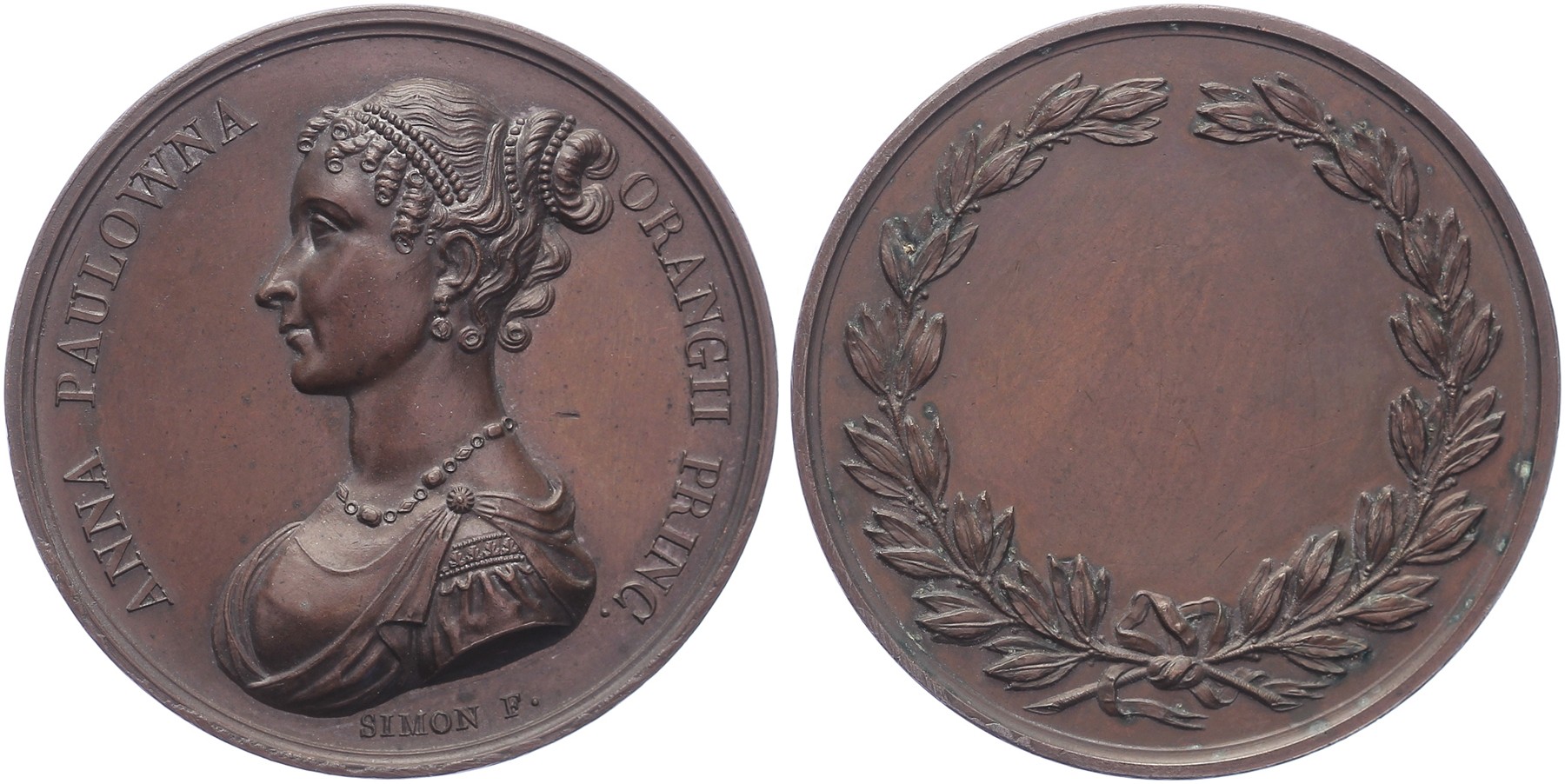 (1816) Anna Paulowna. Borstbeeld naar links gewend. Omschrift: ANNA PAULOWNA ORANGII PRINC. / Mirtenloofkrans. Æ 47. J.H. Simon. Dirks 89. Galerie Simon. Prachtig. - Aangekocht bij Jean Elsen veiling 56, kavel 3187.